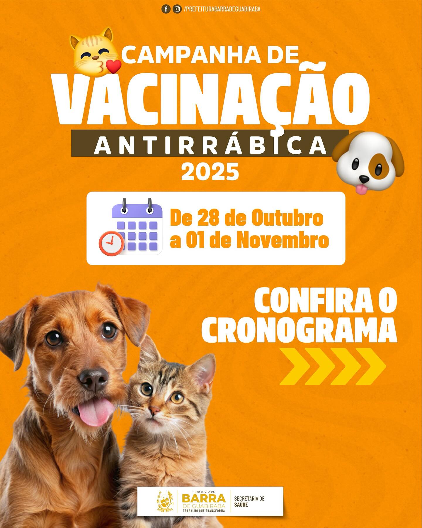 A Secretaria de Saúde de Barra de Guabiraba, através da Vigilância em Saúde, informa que a vacinação antirrábica animal acontecerá de 28 de outubro a 01 de novembro, sendo 01 de novembro o Dia D da campanha.