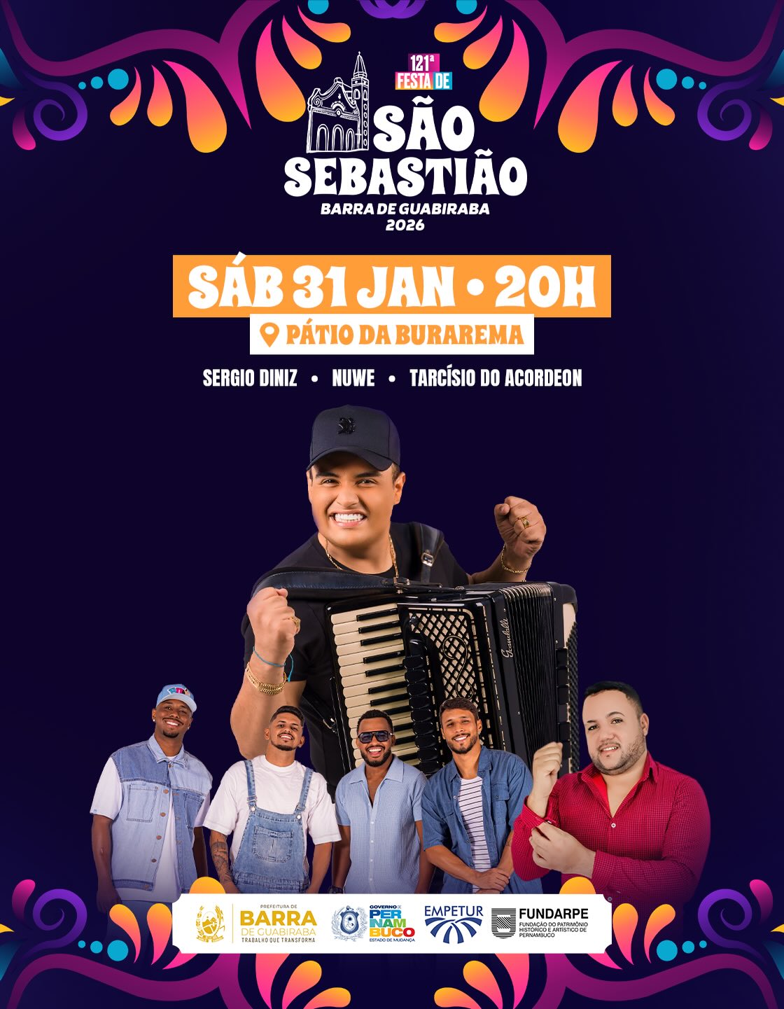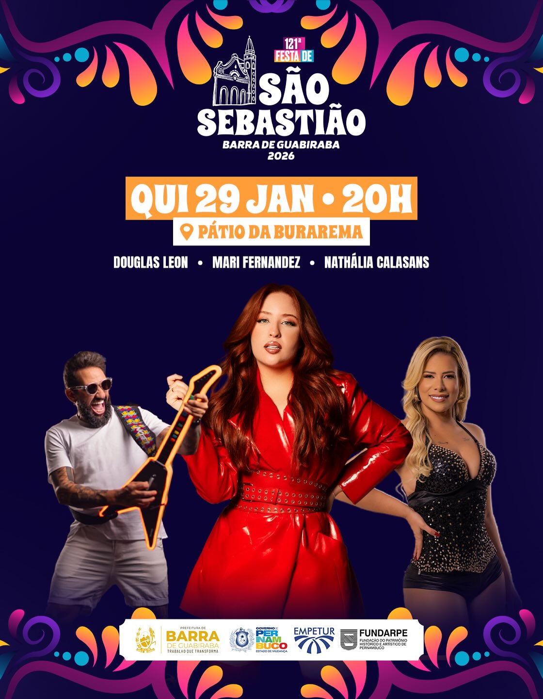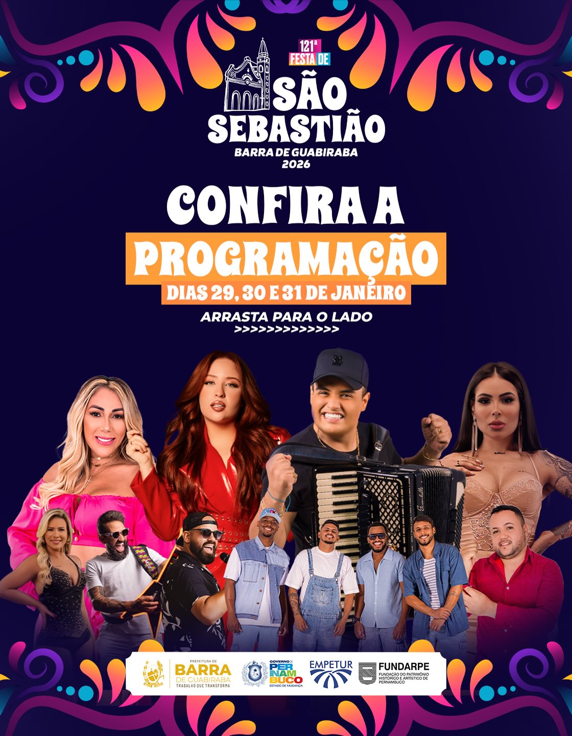 A programação já está completa e promete três dias de muita música, alegria e encontro em Barra de Guabiraba. De 29 a 31 de janeiro, o palco vai receber grandes atrações para celebrar uma das festas mais tradicionais do nosso município.