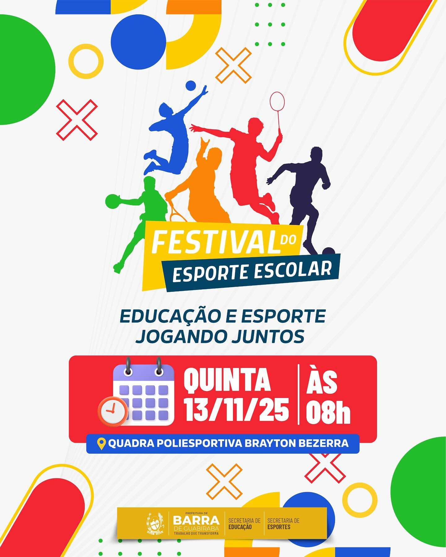 A Prefeitura de Barra de Guabiraba, por meio da Secretaria Municipal de Educação e da Secretaria de Esportes, convida toda a comunidade escolar para prestigiar o Festival do Esporte Escolar, um evento que integra educação, esporte e cidadania.