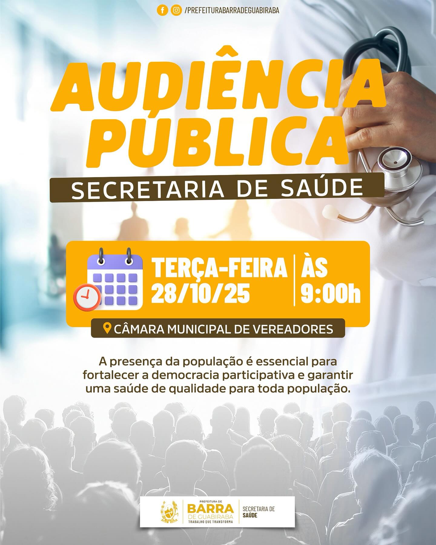 A Prefeitura de Barra de Guabiraba, através da Secretaria Municipal de Saúde, convida toda a população para participar da Audiência Pública de Saúde, que será realizada nesta terça-feira, dia 28 de outubro de 2025, às 09h, na Câmara Municipal de Vereadores.