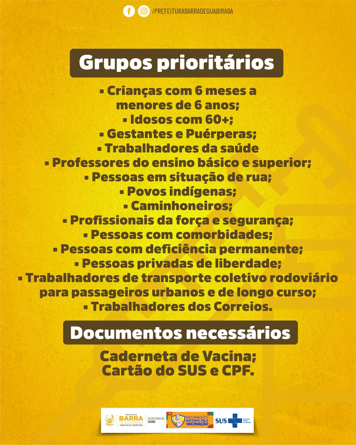 Se você faz parte de um dos grupos prioritários, não esqueça de levar sua caderneta de vacina, cartão do SUS e CPF.